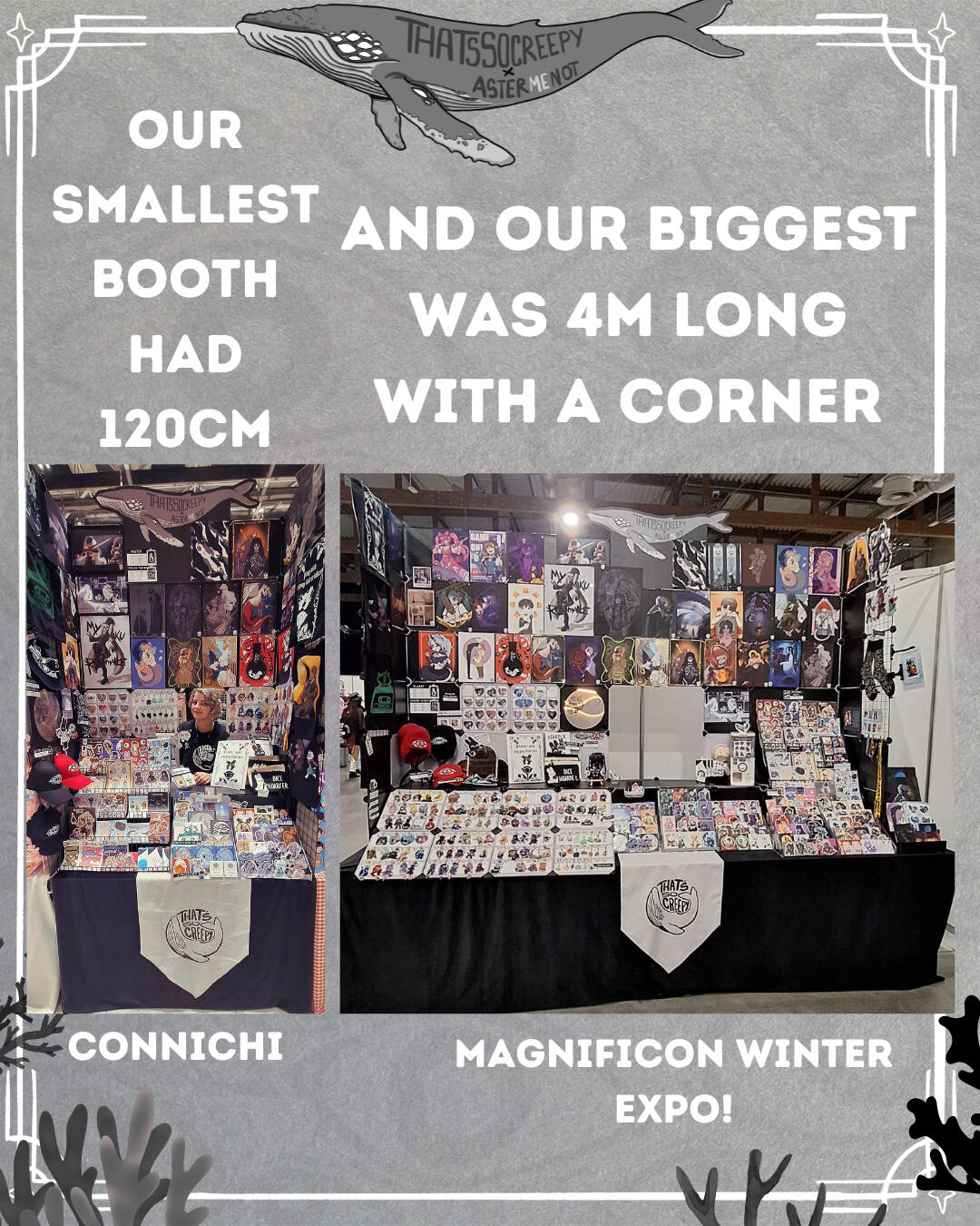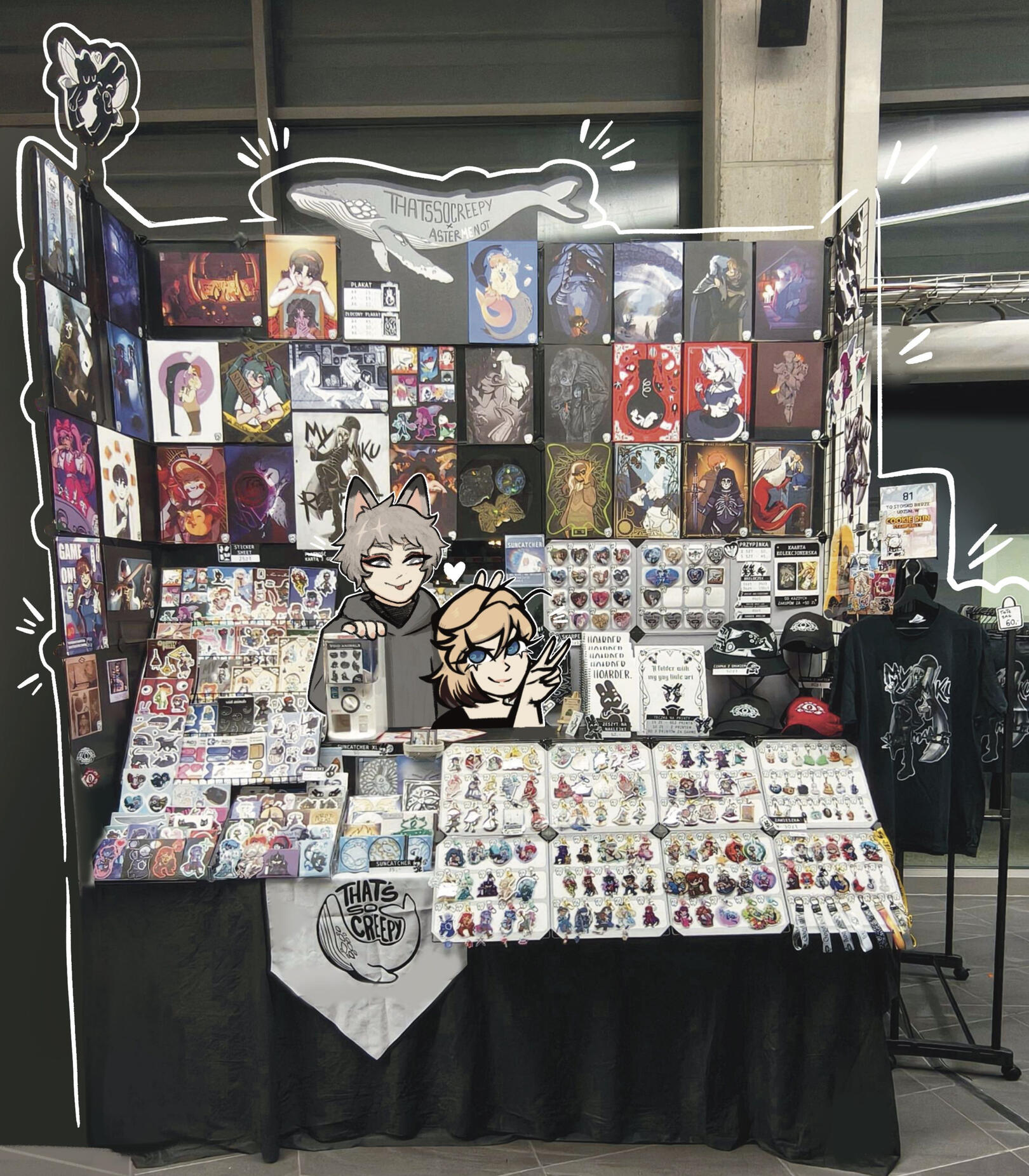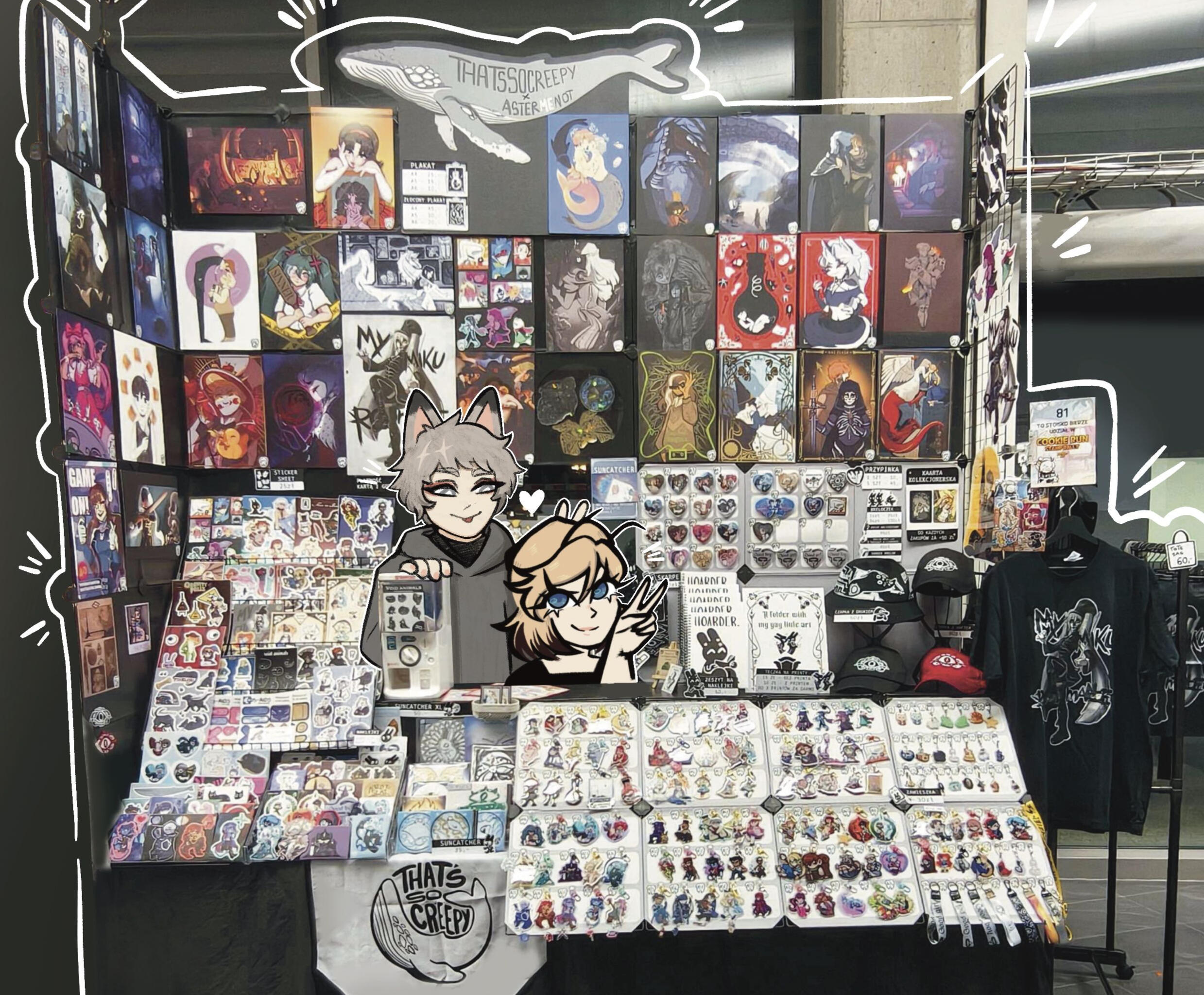 Is that a travelling merchant? It looks a bit like a whale with one too many eyes... Thatssocreepy is a booth by two artists from Poland: Thatssocreepy and AsterMeNot. They travel Europe together to show you their wares. At their booth, along with their original designs you can also acquire fanart in many shapes and sizes. They offer beanies, hair claws, suncatcher stickers, bags, posters, stickers, keychains, sticker albums, pins, enamel pins, socks and many other trinkets and items you may find more or less useful in your adventures.